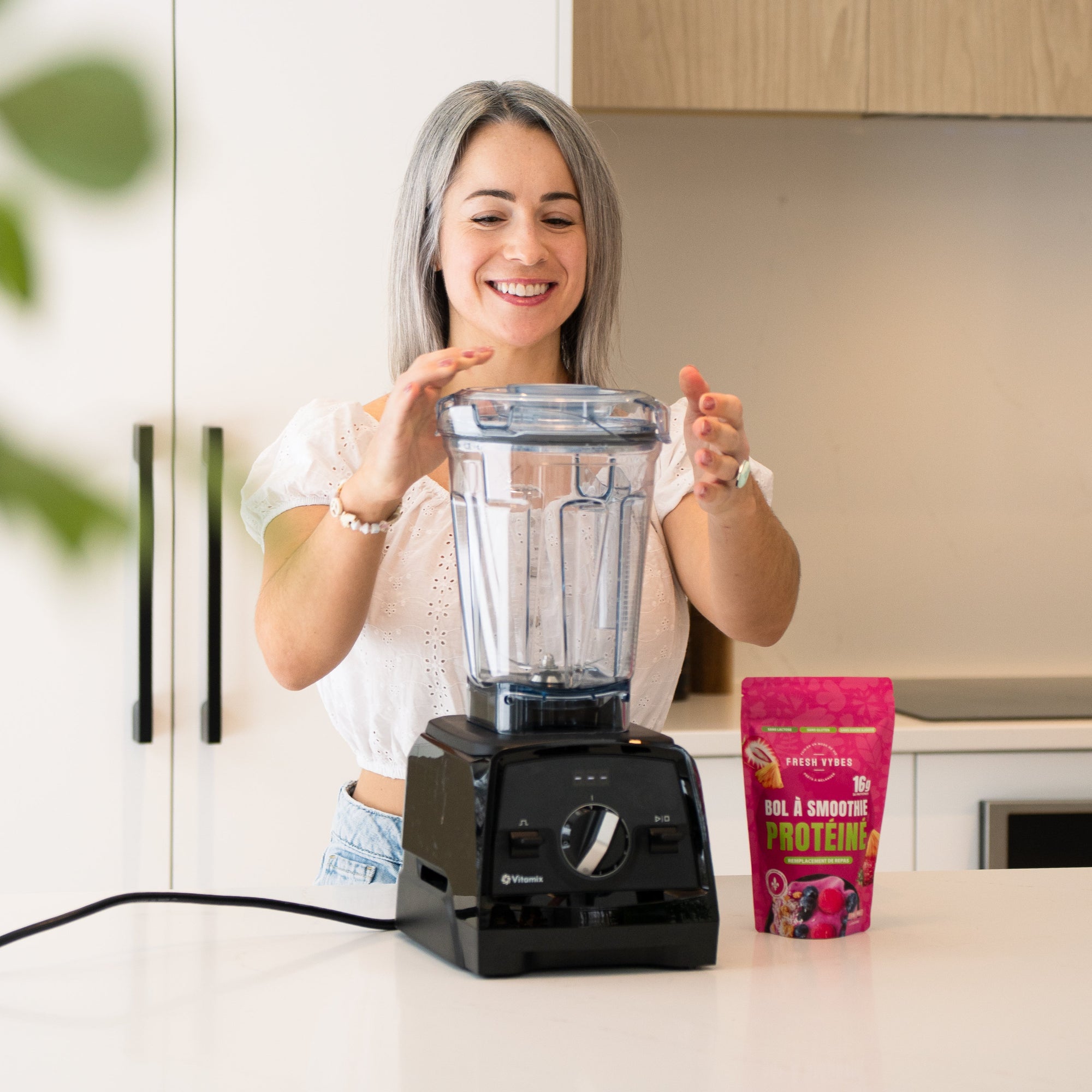 Ajoute 1 tasse de liquide (eau, lait végétal, ton choix) pour un smoothie classique, ou 3/4 de tasse pour un smoothie bol épais. Mélanger.